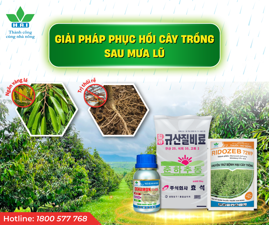 Bộ sản phẩm Ridozeb 72WPDekamon 22,43SL, HAI-Silicate Calcium (phân bón SCF) là giải pháp được nhiều nhà vườn lựa chọn nhờ hiệu quả rõ rệt trong phục hồi rễ, bật lá xanh nhanh sau mưa lũ.