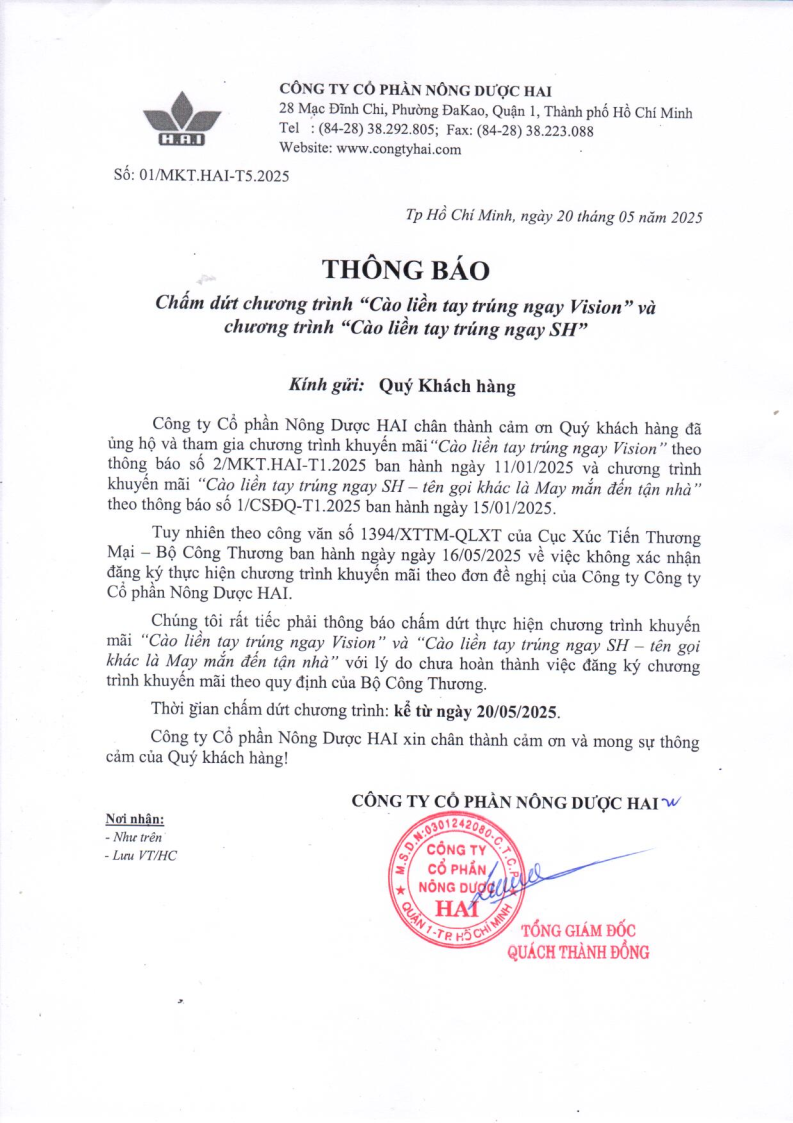 ▪️ Công ty Cổ phần Nông Dược HAI xin trân trọng cảm ơn Quý Khách hàng đã quan tâm, tin tưởng và đồng hành cùng chúng tôi trong suốt thời gian triển khai hai chương trình khuyến mãi: