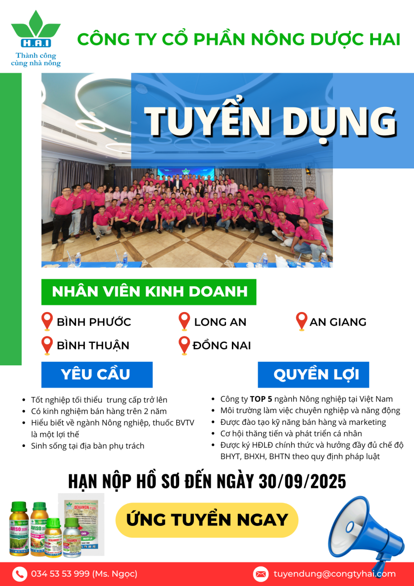 - Nhân viên Sales (Mảng thuốc BVTV): Thu nhập từ 15 TRIỆU + Thưởng KPI +++