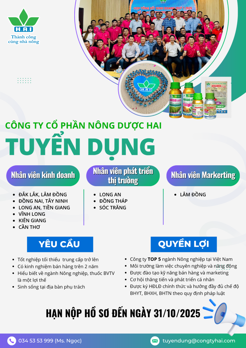 Do nhu cầu mở rộng kinh doanh, HAI đang cần tuyển thêm vị trí (Mảng thuốc BVTV): - NHÂN VIÊN KINH DOANH - NHÂN VIÊN PHÁT TRIỂN THỊ TRƯỜNG - NHÂN VIÊN MARKETING